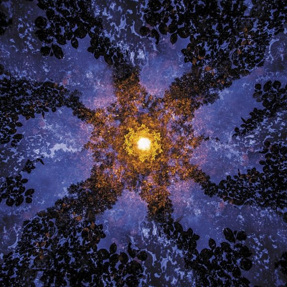 Tussen elke belichting draait hij de camera ±45 graden om zijn eigen as, terwijl hij continu scherpstelt op één brandpunt.