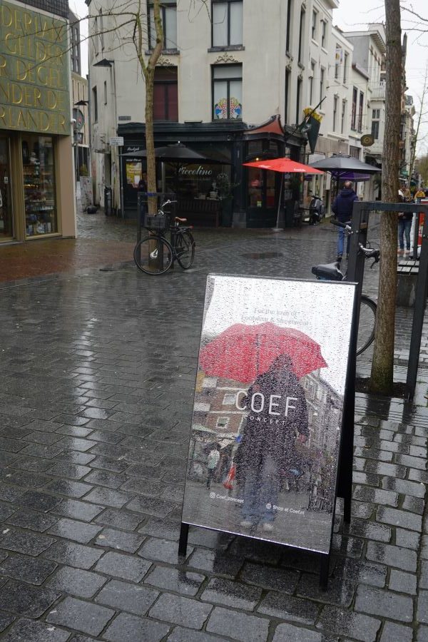 Na een paar zonnige dagen slaat het weer om. De regen valt gestaag en er staat een kille wind. De leden van de themagroep straatfotografie laten zich niet kennen en spreken af bij P+R Nijmegen om vervolgens met de bus naar het centrum te rijden. Onder het genot van een cappuccino en chocolademelk spreken ze af om afzonderlijk het centrum van Nijmegen in te gaan. Het is een grote uitdaging voor de fotografen om in dit druilerige weer een interessante foto te maken. Lege straten, glimmende keien, paraplu’s, terrasmeubilair druipend in de regen, donkere terrasjes onder natte parasols. Kies ik voor een kleur, het verhaal of mensen schuilend onder hun paraplu’s? Na anderhalf uur verzamelen Hester, Ineke, Johan, Linda en Peter in het restaurant De Waagh op de Markt. Het vogelhofje in de benedenstad van Nijmegen is een interessant onderwerp voor Peter en Johan. Hester brengt haar foto’s van de camera over op haar mobiel en deze geven haar enige hoop. De fototoer van Linda is een moment van ontspanning.