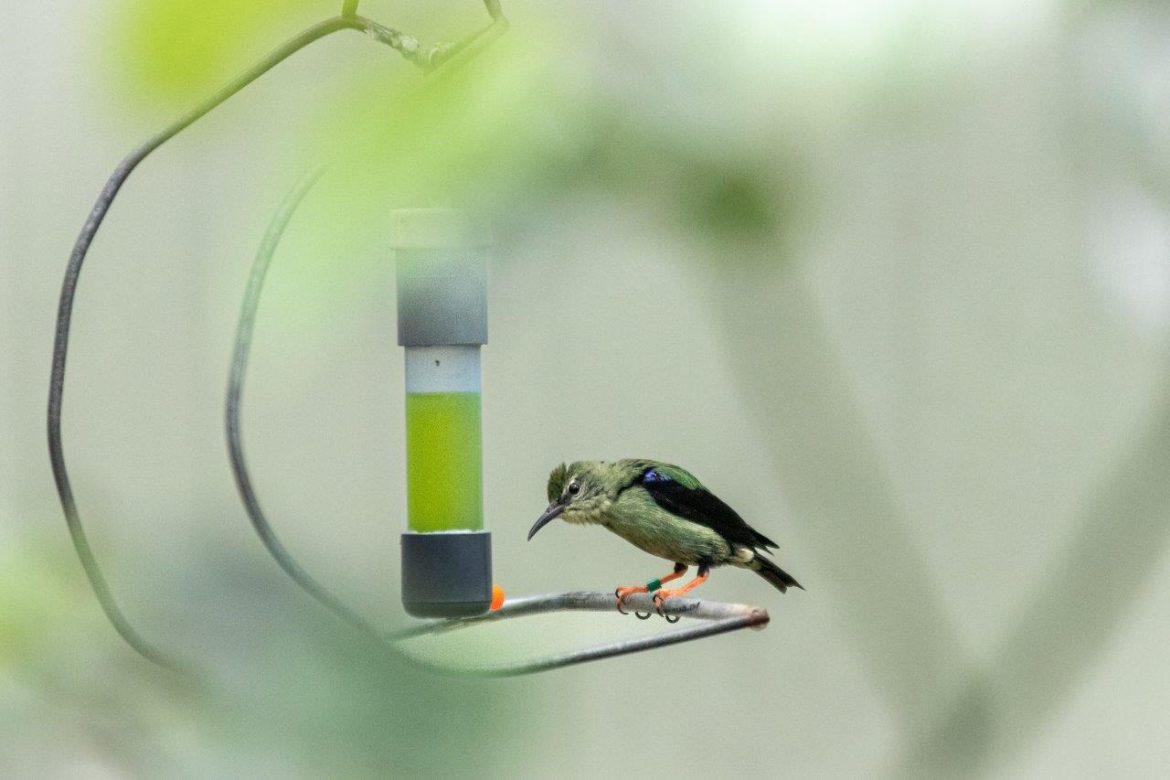 Dit is het vogeltje waardoor alle andere vogeltjes op de foto’s net niet door gingen. Want deze vogel is in alle opzichten een plaatje. De lijnen, het groen op de voorgrond, de manier waarop het beestje zit – het lijkt een beetje een oud mannetje met een lange jas – de herhaling van kleuren (twee keer oranje, het grijs van de veertjes en het grijs van de feeder, de kleur van het flesje met de kleur van de vogel) gewoon goed.